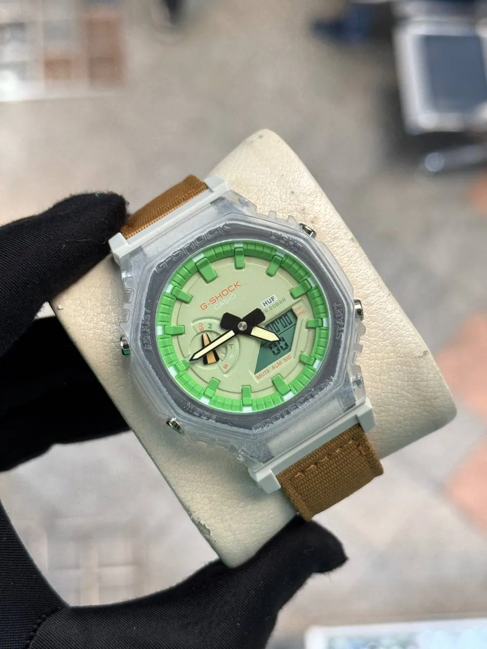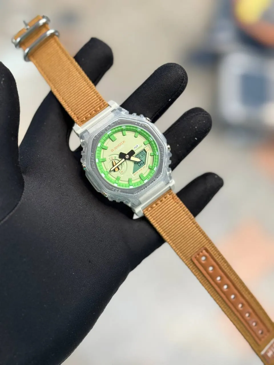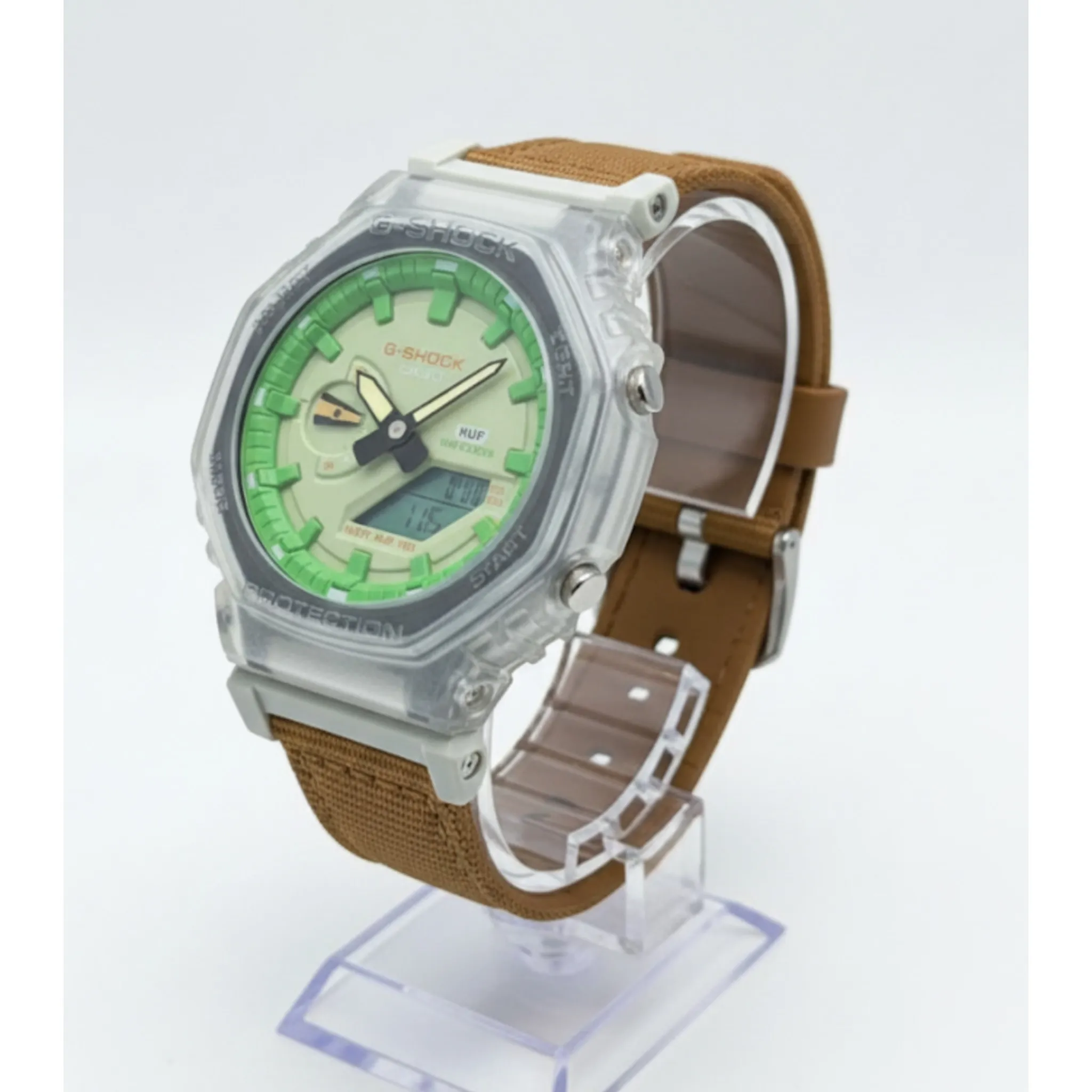 ساعت جی شاک2100بند برزنتی عسلی صفحه سبز