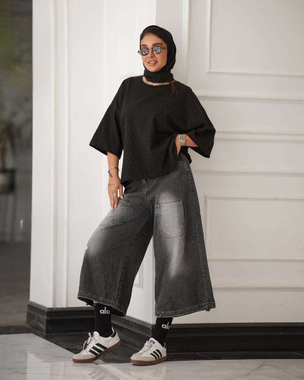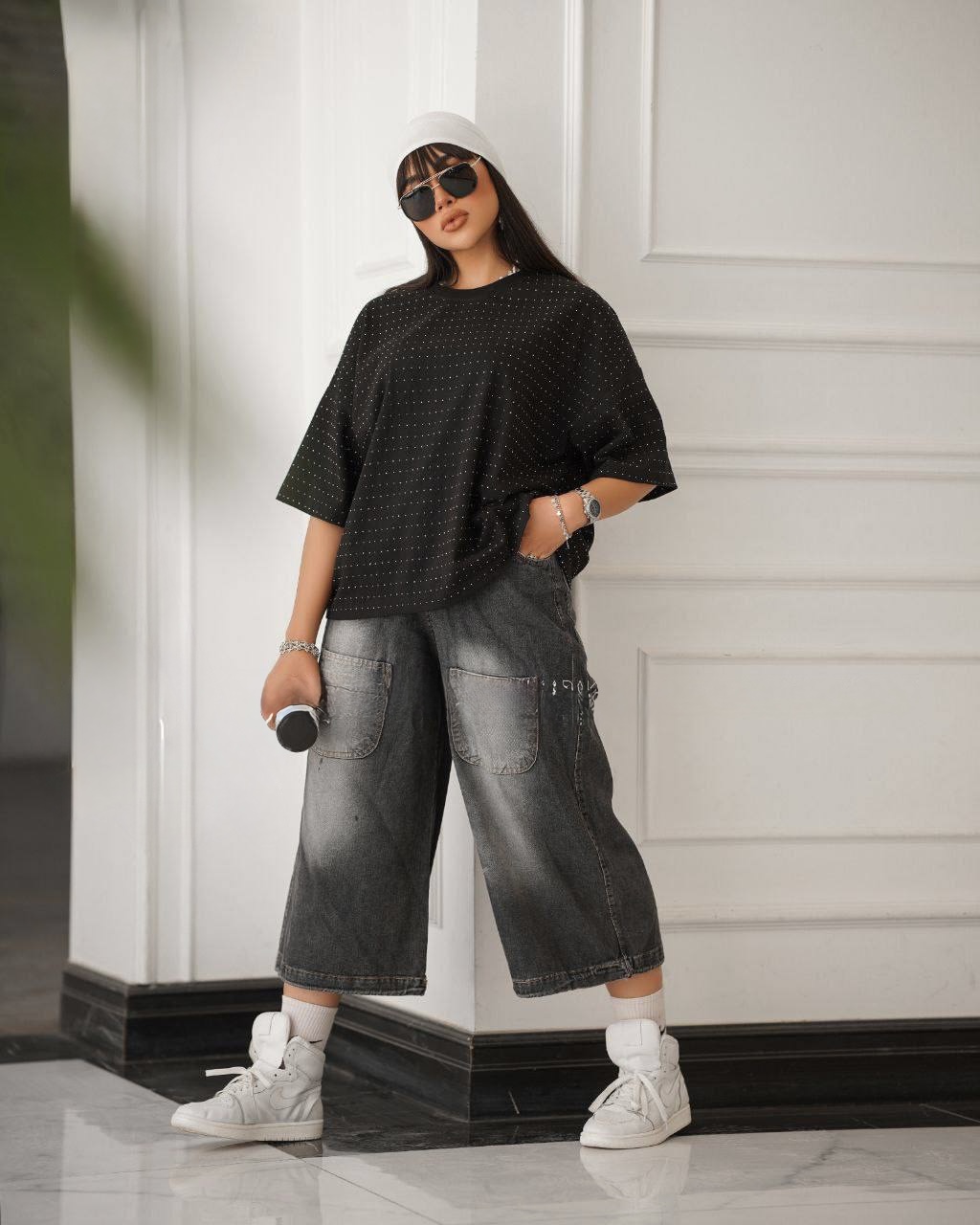 ست تيشرت نگين دار و شلوار وايت لگ